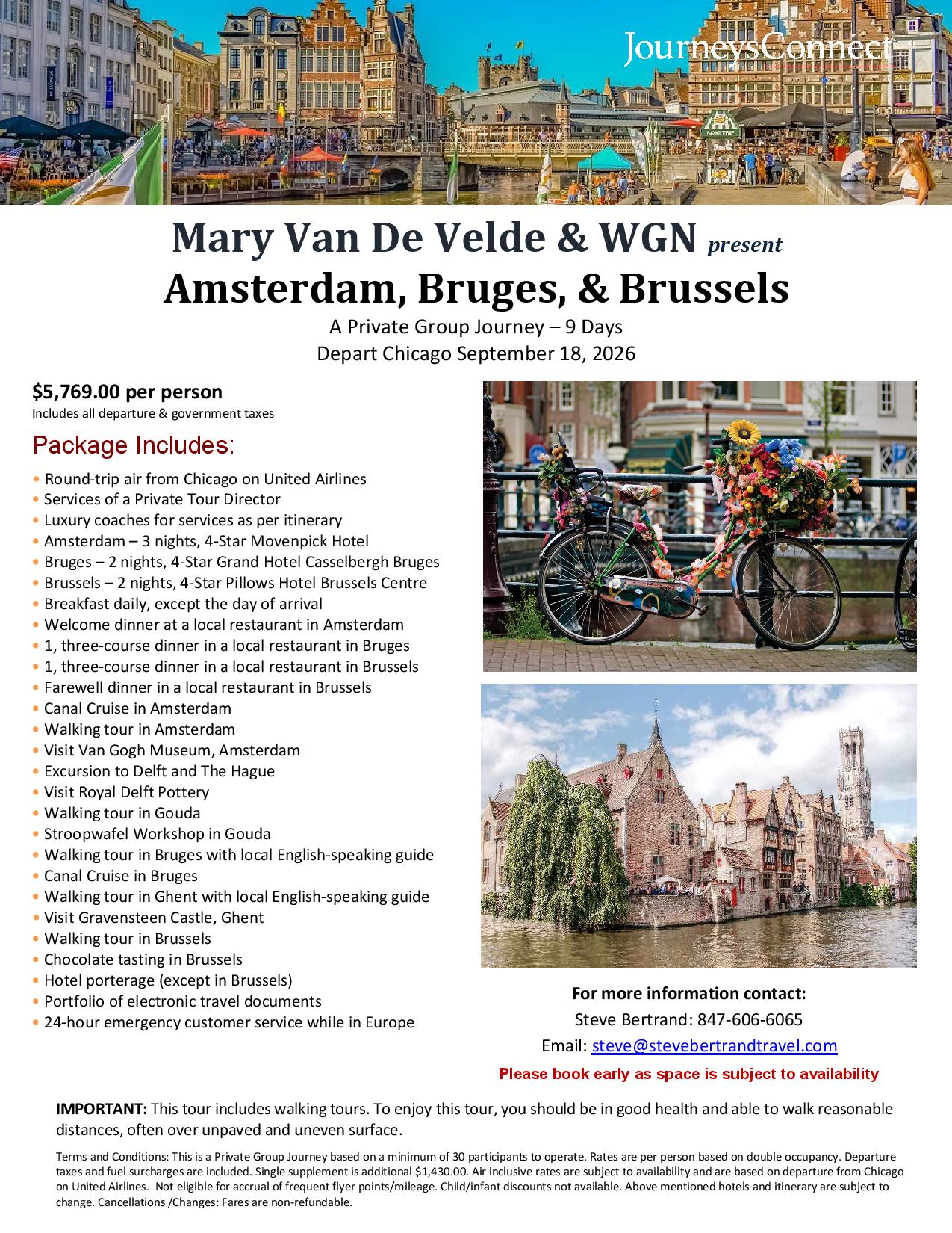 SEPTEMBER 18 – USA / AMSTERDAM: Depart from Chicago on your overnight flight to Amsterdam.