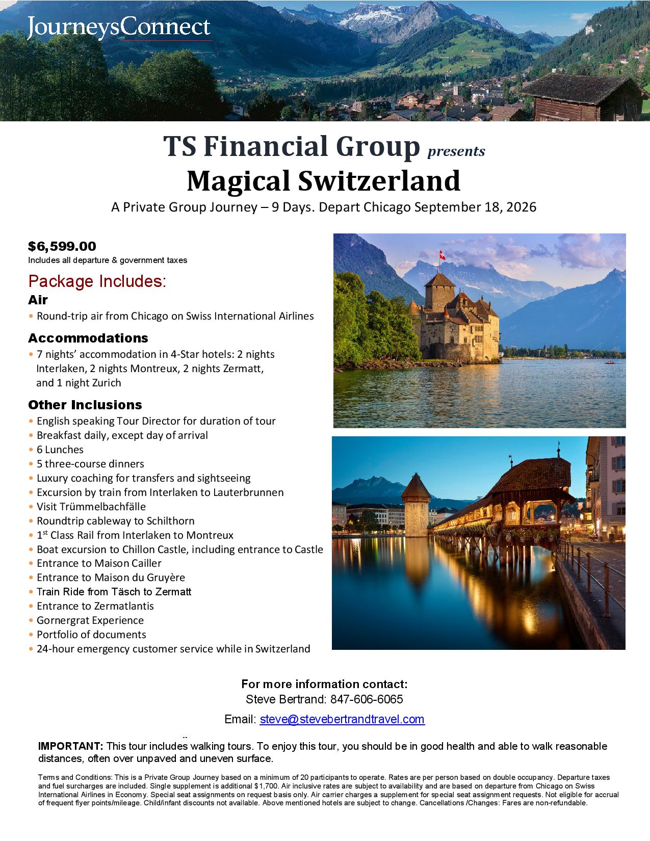 This is a Private Group Journey based on a minimum of 20 participants to operate. Rates are per person based on double occupancy. Single supplement is additional $1,700. Child/infant discounts not available. Above mentioned hotels are subject to change. Cancellations /Changes: Fares are non-refundable. Air inclusive rates are subject to availability and are based on departure from Chicago on Swiss International Airlines in Economy. Special seat assignments on request basis only. Air carrier charges a supplement for special seat assignment requests. Not eligible for accrual of frequent flyer points/mileage. Child/infant discounts not available. Cancellations/Changes: Payments are non-refundable. Substantial restrictions apply for cancellation/change, and depend upon the package type. Trip protection is recommended. The applicable Travel Protection Plan will be applied to your purchase. Additional details will be provided on your Itinerary and Travel Protection Plan Voucher travel documents upon purchase. For travelers on offered Escorted Vacations, Golf, or Cruise Vacations, travel protection is provided by Trip Mate Inc. This coverage is designed to protect your travel investment with a full cash refund less the cost of the insurance and cancellation fees for the following covered reasons such as death, sickness, injury or certain other covered reasons. Full description of coverage can be found by clicking here. The cost of this protection is 8.5% of the total cost of your trip and must be purchased at time of booking. All claims are to be made to Trip Mate Inc.